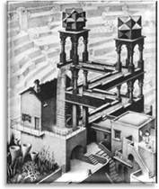 Maurits Cornelis Escher (1898 – 1972), usually referred to as M. C. Escher , interpreted ideas of multi-dimensional planes where objects refused to remain on their own plane and leapt to another, defying the laws of aspect and perception. He challenged the rules of perspective and the viewpoint of the observer by skewing the eye’s ability to follow a line to the vanishing point beyond the horizon.